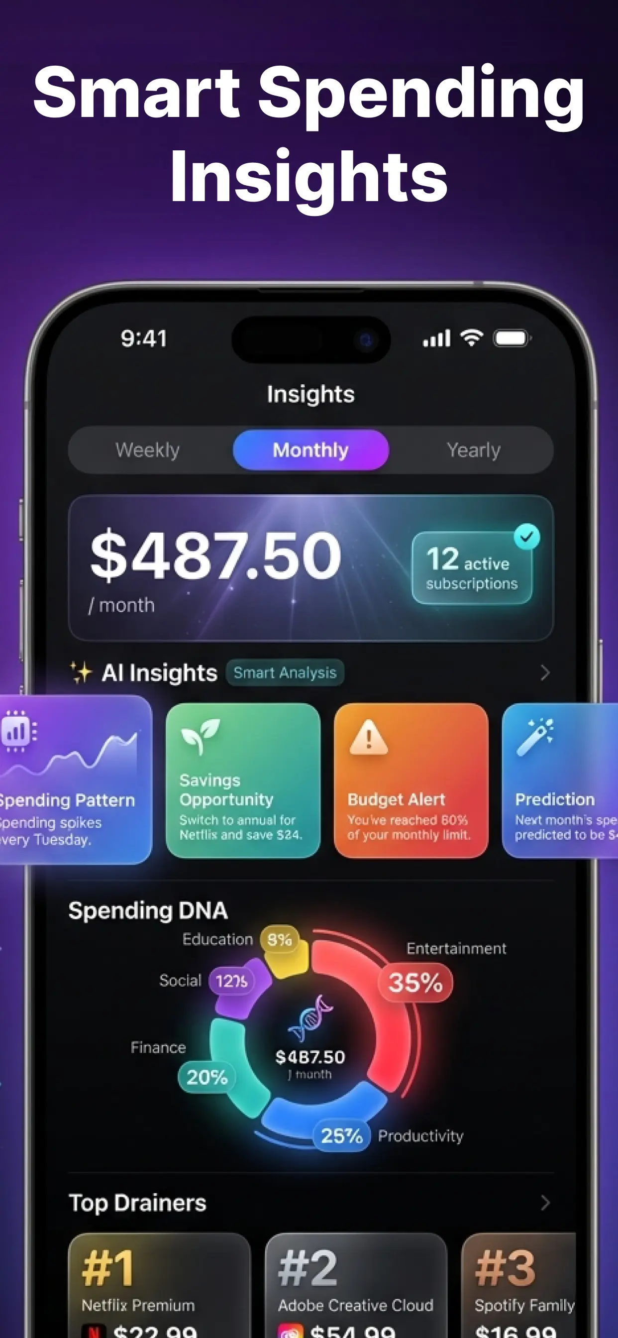 Weekly, monthly, and yearly analytics to understand your subscription spending patterns.